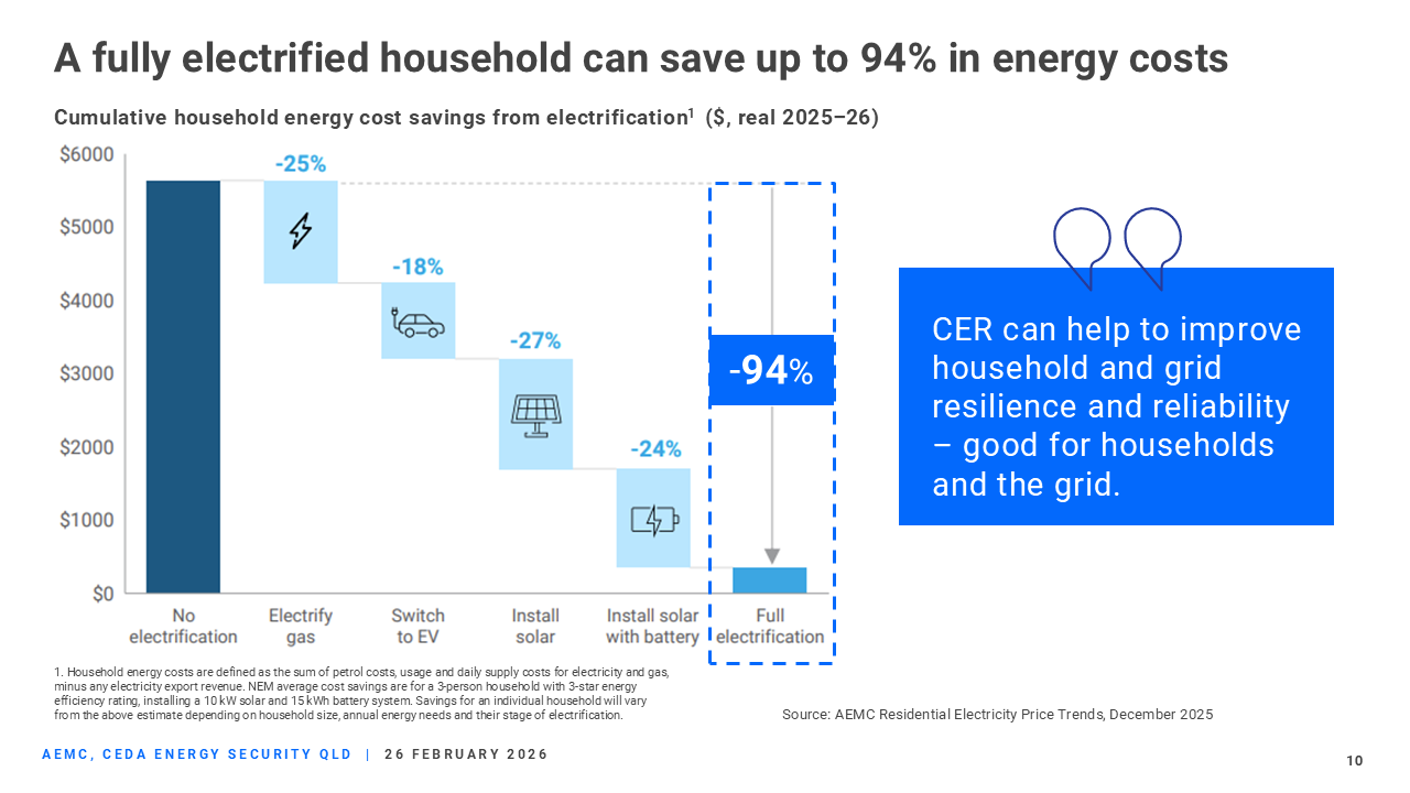 The AEMC's latest Residential Electricity Price Trends report shows that electrification is one of the most powerful tools that households have to cut their energy bills. Installing rooftop solar and a battery, switching to EVs, and replacing gas appliances with efficient electric ones can lower total household energy costs by up to 90 per cent per year.