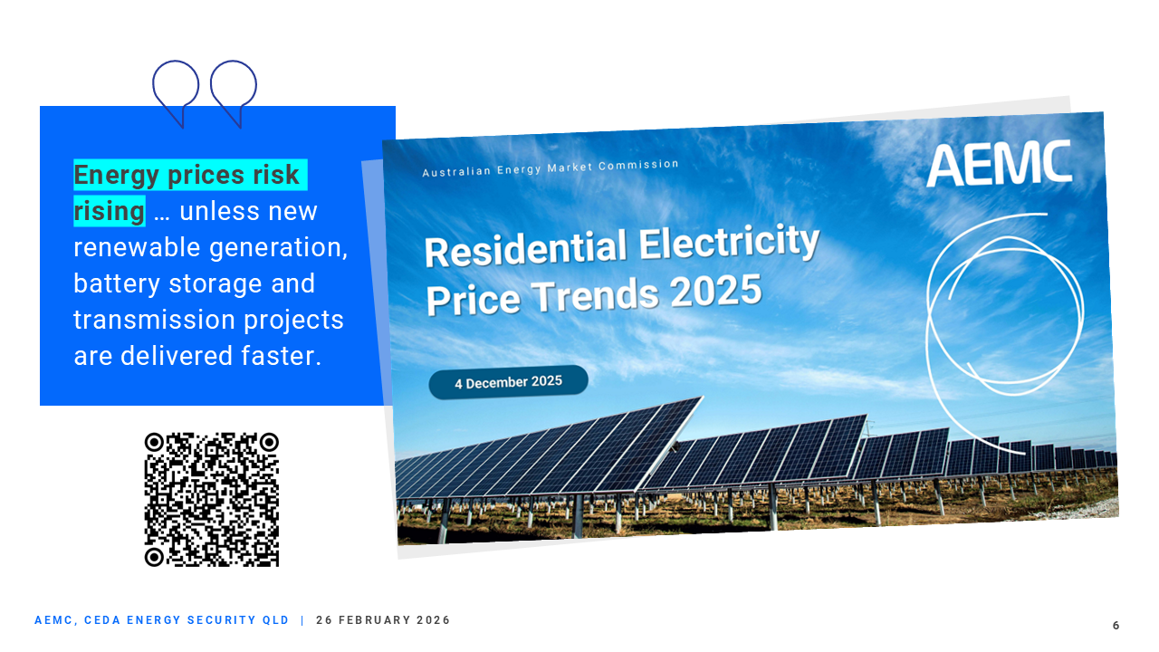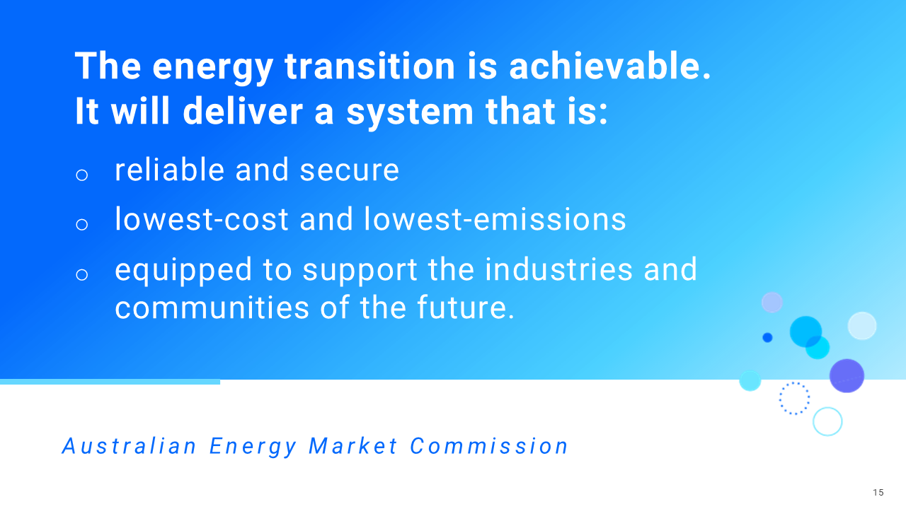 The AEMC has been working hard to achieve this goal. For example, a recent reform, the integrating price-responsive resources rule change, will enable resource aggregators to participate in the wholesale electricity market, reducing system costs.
