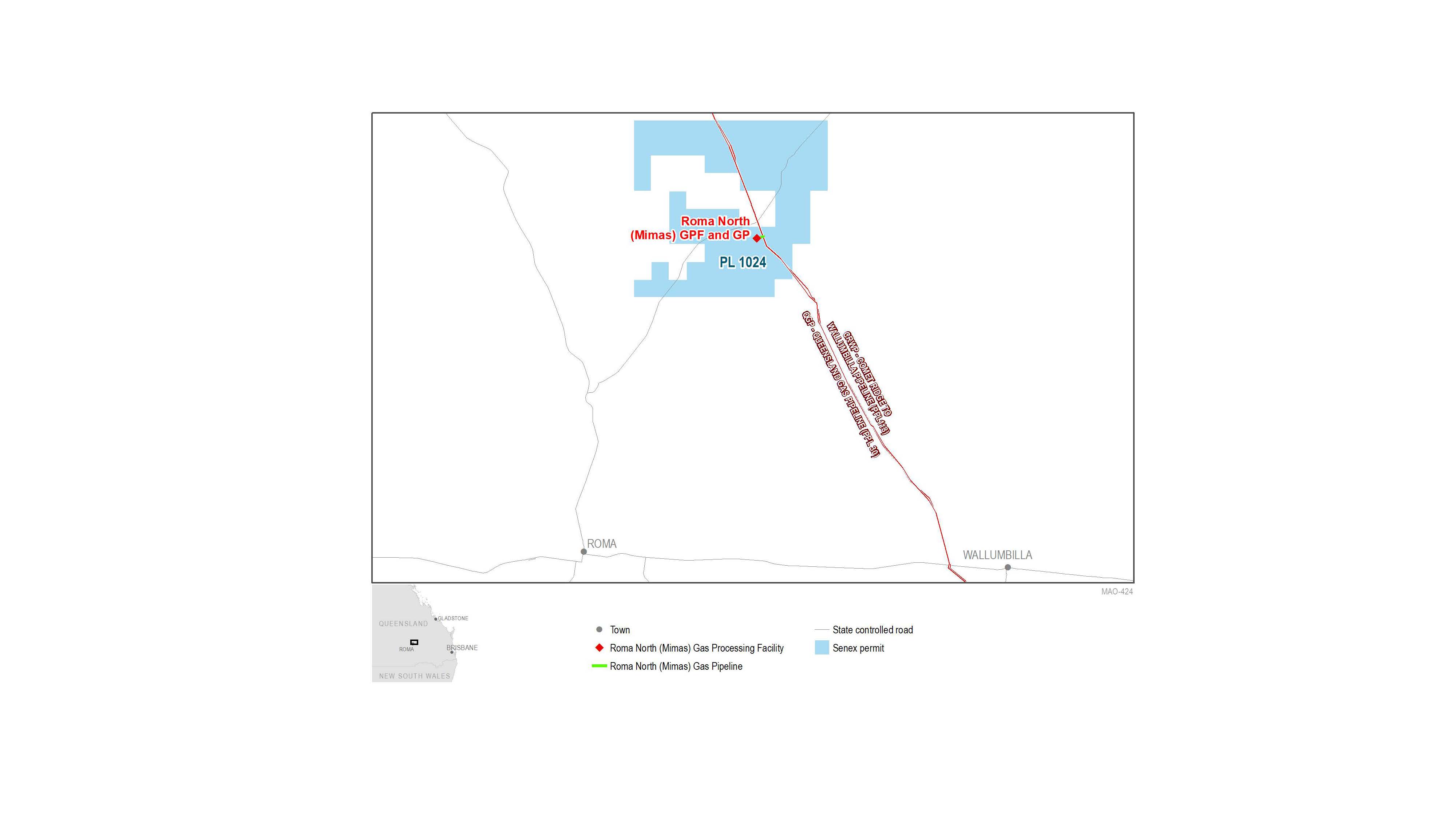 The Roma North (Mimas) Gas Pipeline (RNMGP) is a short lateral high-pressure pipeline located north of Roma, Queensland. It will convey natural gas from the Roma North (Mimas) Gas Processing Facility to Comet Ridge to Wallumbilla Pipeline (CRWP) and Queensland Gas Pipeline (QGP).