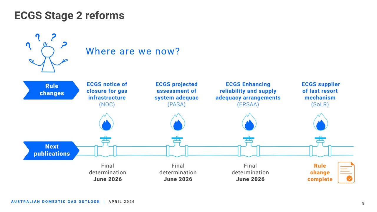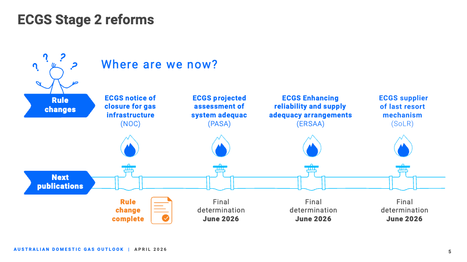 Our work stream spans market design and system visibility, through to the future of gas networks, and a broad and coordinated reform program aimed at making sure the East Coast Gas System remains reliable, resilient and fit for purpose through the energy transition.